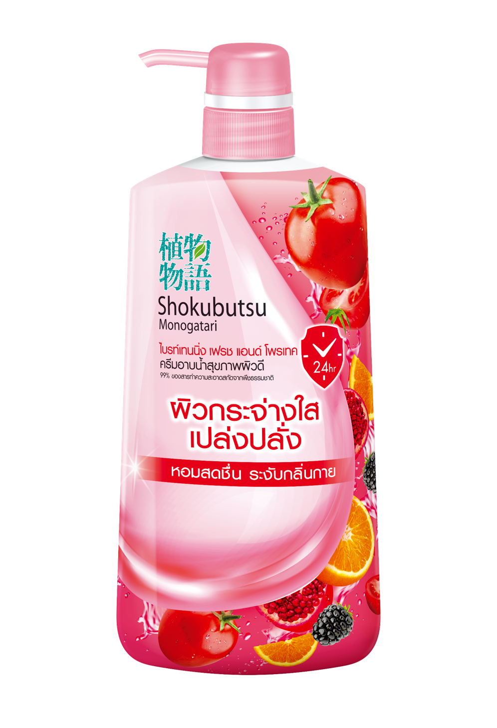 บำรุงผิวด้วย มะเขือเทศ ส้ม ทับทิม และมัลเบอร์รี่ ที่มี AHA และวิตามิน C&E ช่วยดูแลผิวให้กระจ่างใส เปล่งปลั่ง พร้อมระงับกลิ่นกายยาวนาน